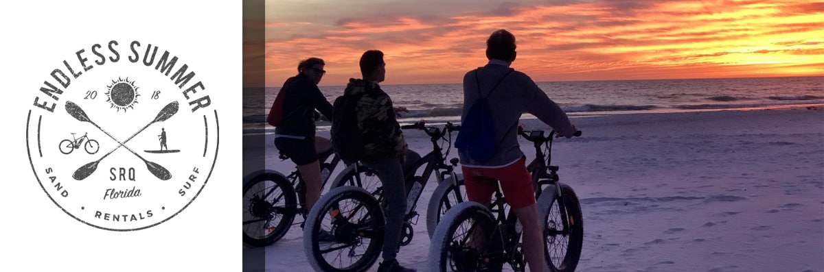 Our e-bike rentals are a great way to get around Sarasota. You will get a Rad Rover bike, and you can rent it for an hour, half day, or full day. The bike features 26” Kenda fat tires, which makes it ideal for both the streets of downtown Sarasota and the sandy beaches of Siesta Key. It has a top speed of about 20 mph, and the battery range average is between 25-45 miles. Extra batteries can be rented for an additional $10. For more information about our bike rental services, contact Endless Summer Eco Tours and Rentals today!